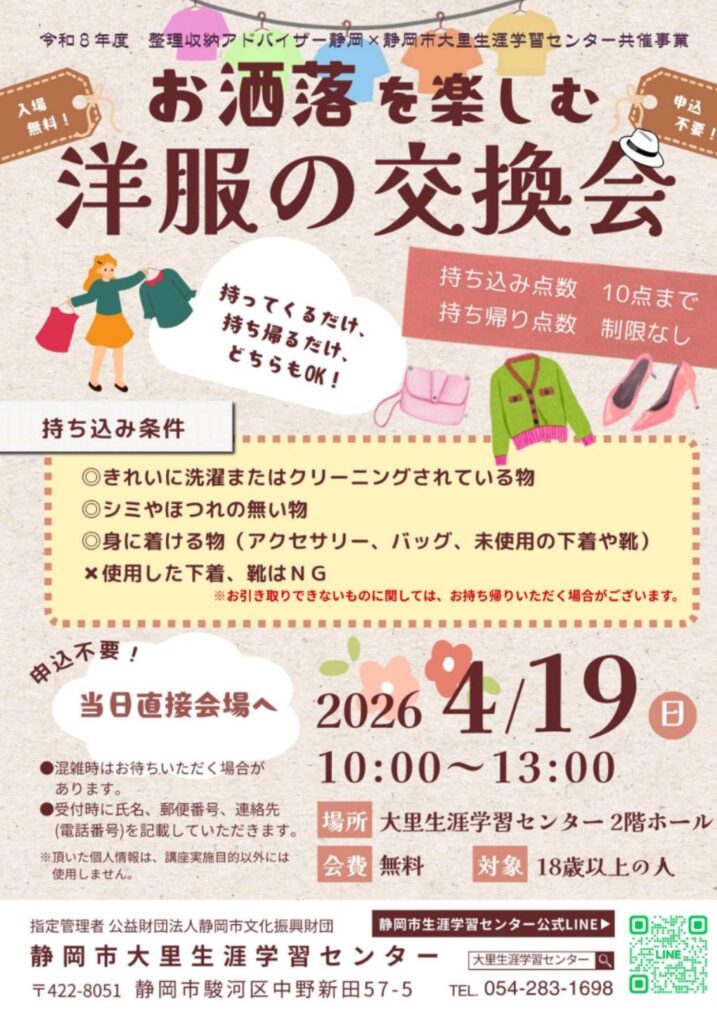 2026年4月10日 / 最終更新日時 : 2026年4月10日 kaiteki お知らせ お洒落を楽しむ洋服の交換会 【整理収納アドバイザーと大里生涯学習センター共催】 2026 4/19 10:00~13:00 会場:大里生涯学習センター 参加費:無料